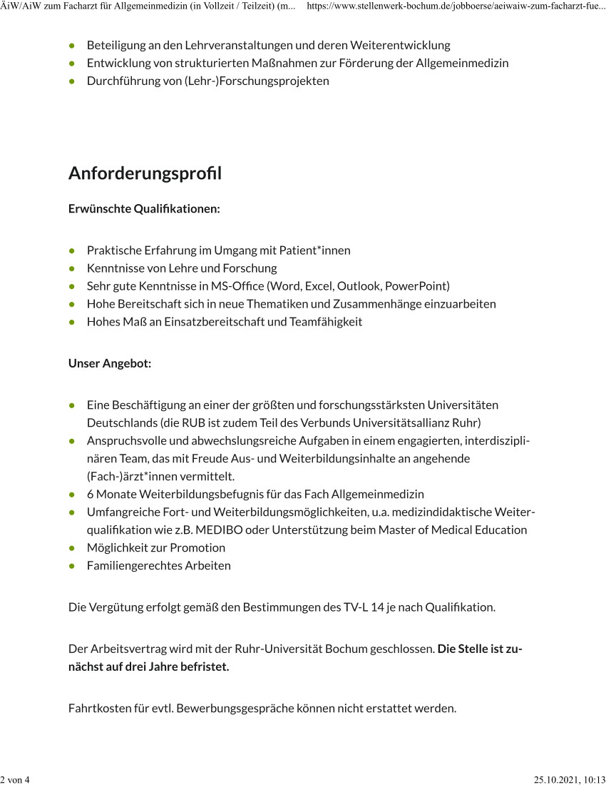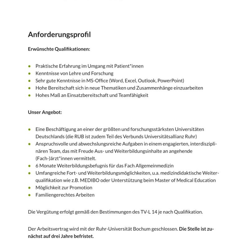 zur Mitwirkung in Lehre und Forschung, möglichst in der Weiterbildung zur/zum Fachärztin/Facharzt für Allgemeinmedizin. Voraussetzung ist das Vorliegen der ärztlichen Approbation.