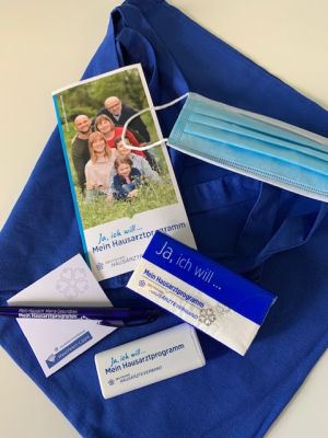 Inhalt: "Mein Hausarztprogramm"-Stofftasche, -Pflasterbox, -Taschentücher, Kugelschreiber, HZV-Patientenflyer, Haftnotizen und Mund-Nasen-Maske 3-lagig mit FFP1-Klassifikation