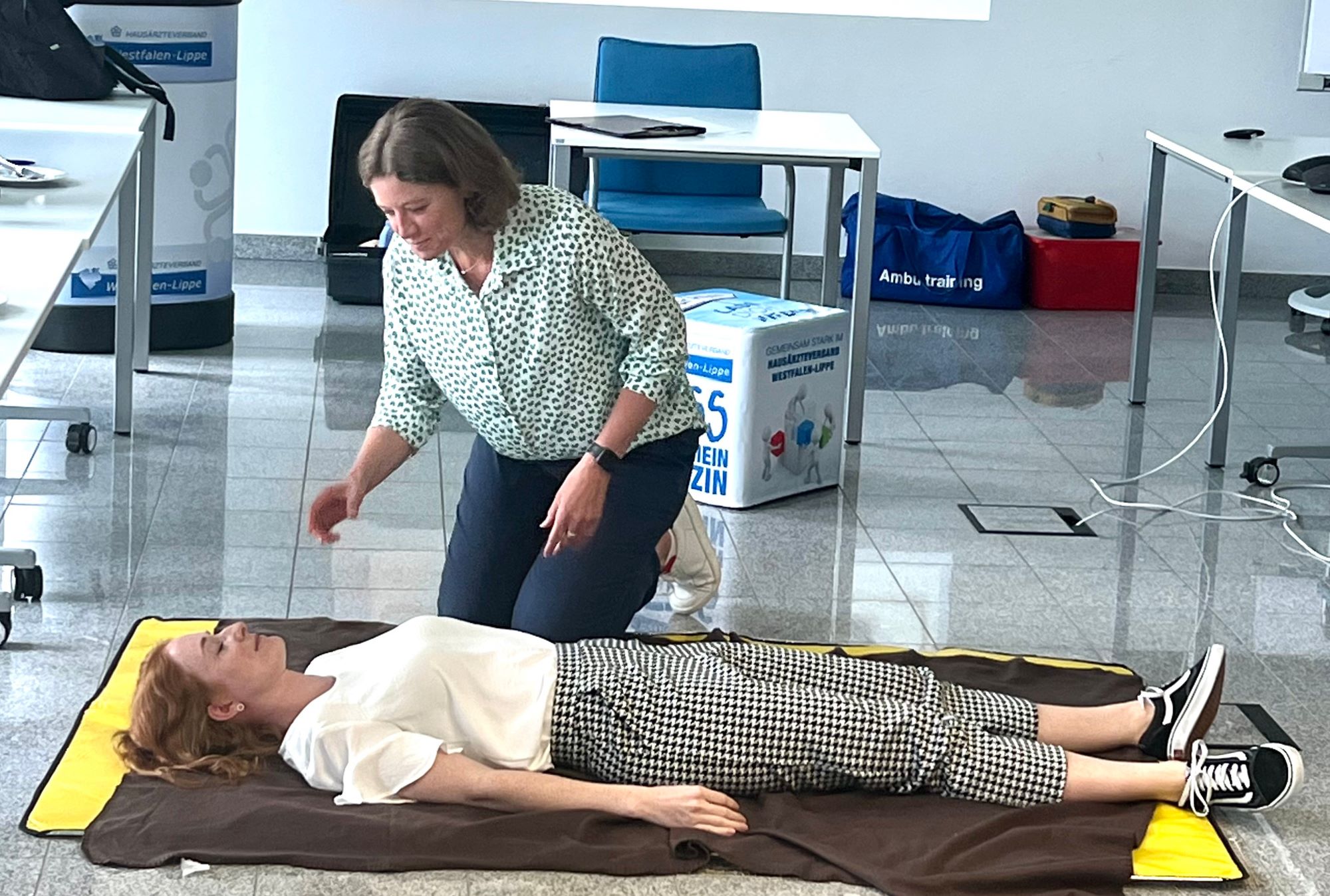 Anders sieht das beim Hausärzteverband Westfalen-Lippe aus: Obwohl eigentlich nur ein Ersthelfer samt Vertreter nötig wäre, werden die Mitarbeiter*innen der Geschäftsstelle in Unna regelmäßig in Erste Hilfe geschult. „Bei uns sind alle Ersthelfer*innen“, erklärt Claudia Diermann, Geschäftsführerin der Hausärztlichen Service- und Wirtschaftsgesellschaft mbH Westfalen-Lippe. „Wir haben unterschiedliche Arbeitsmodelle. Umso wichtiger ist es im Ernstfall, dass alle in der Lage sind, zu helfen.“
