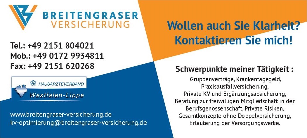 Bei einer Tarifvielfalt von mehr als 12.000 Tarifkombinationen ist es für den einzelnen Kunden schwierig, einen Überblick zu gewinnen, zu vergleichen und verbesserte Leistungen bei gleichzeitiger Beitragsreduzierung zu finden. Mit dem neuen Kooperationspartner stellt der Hausärztinnen- und Hausärzteverband Westfalen-Lippe seinen Mitgliedern einen Dienstleister an die Seite, der sie umfassend über das Tarifangebot des jeweiligen privaten Krankenversicherers informiert und im Rahmen eines Tarifwechselvorschlages das optimale Preis-Leistungsverhältnis für den Versicherungsnehmer erarbeitet. „Ich biete dabei ein Gesamtkonzept aus dem Versorgungswerk, der freiwilligen Mitgliedschaft in der Berufsgenossenschaft für Gesundheitsdienst und Wohlfahrtspflege (BGW) und der privaten Krankenversicherung. Und das mit Hilfe unterschiedlicher Rahmen- und Gruppenverträge in den Sparten Krankenversicherung, Praxisausfallversicherung, Krankentagegeld, Private Risiken und Berufsunfähigkeitsversicherung“, sagt Thomas Breitengraser. Eine Honorierung erfolgt dabei nur im Erfolgsfall.